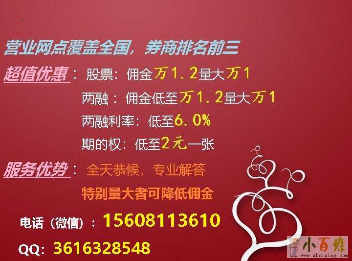 我司是业内排名前几上市大券商,支持股票期货期权两融等业务办理欢迎www.xbaixing.com。现在我司办理开户业务可享特大优惠!(较低的佣金和利率对于长期高频短线交易的客户来说一年可以节约上万元交易费用,开源更节流!)